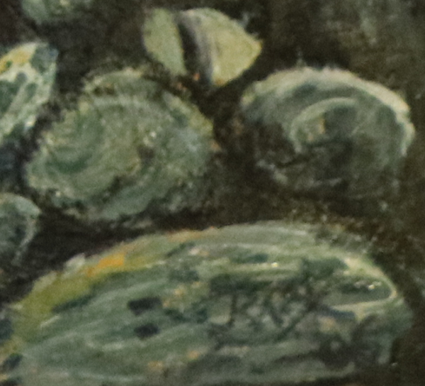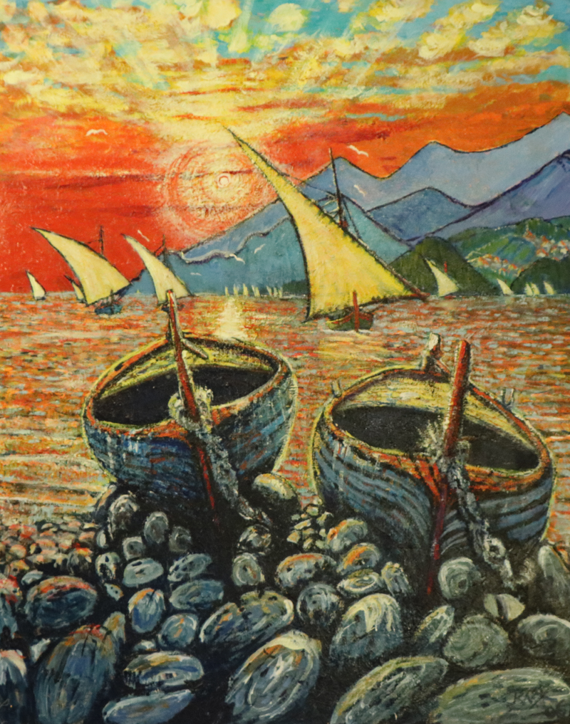 This painting of a couple boating on the river surrounded by water lilies and goldfish is in a style reminiscent of Monet. It is an experiment with the water lilies framing the central picture of the couple boarding the boat.